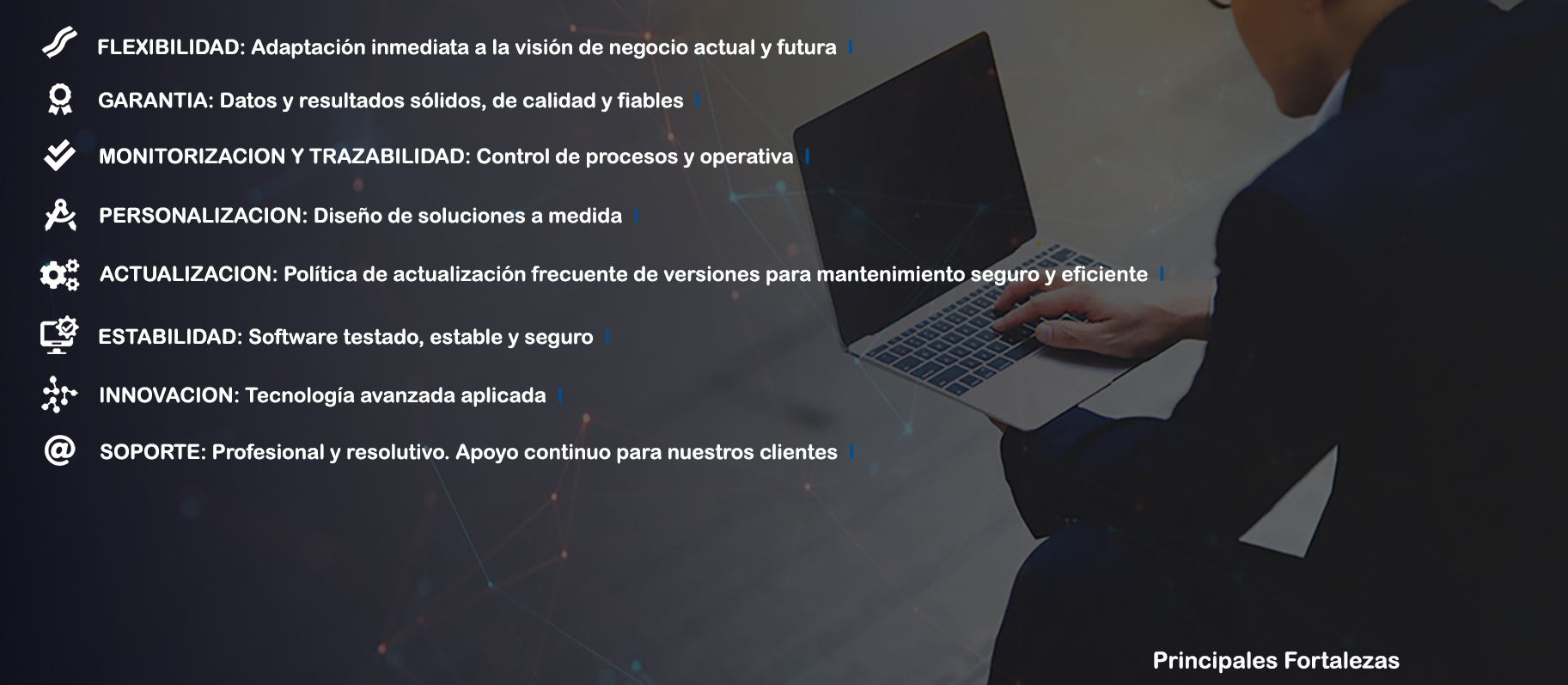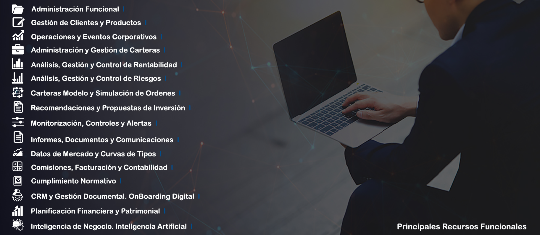 Optimización de procesos automáticos para gestión de clientes y productos, gestión y operativa de carteras, gestión y operativa de vehículos de inversión colectiva complejos multidivisa y reporting integrado. Ciclo global front-middle-back. Innovación y digitalización.